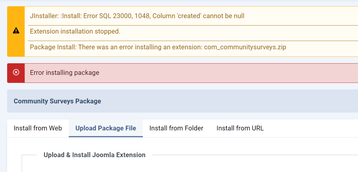 "JInstaller::Instalacja: Błąd SQL 23000, 1048, Column 'created' cannot be null."