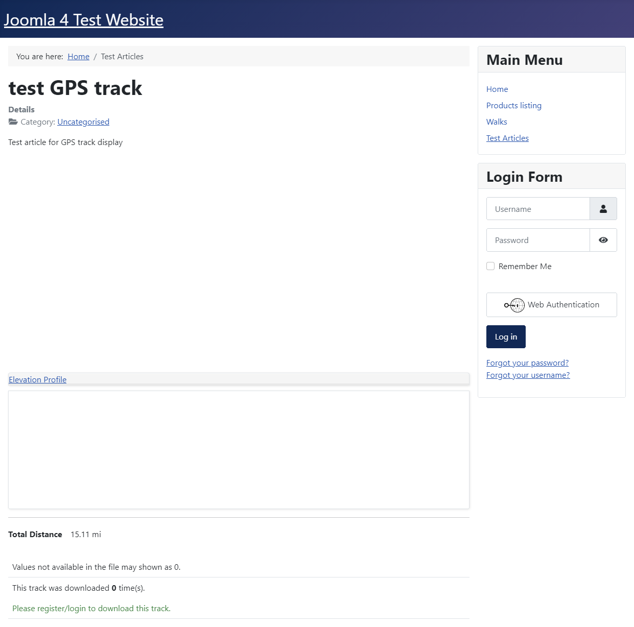 Article: the Track button now appears below the article editor and successfully inserts the track reference but it does not display the track or the elevation profile.