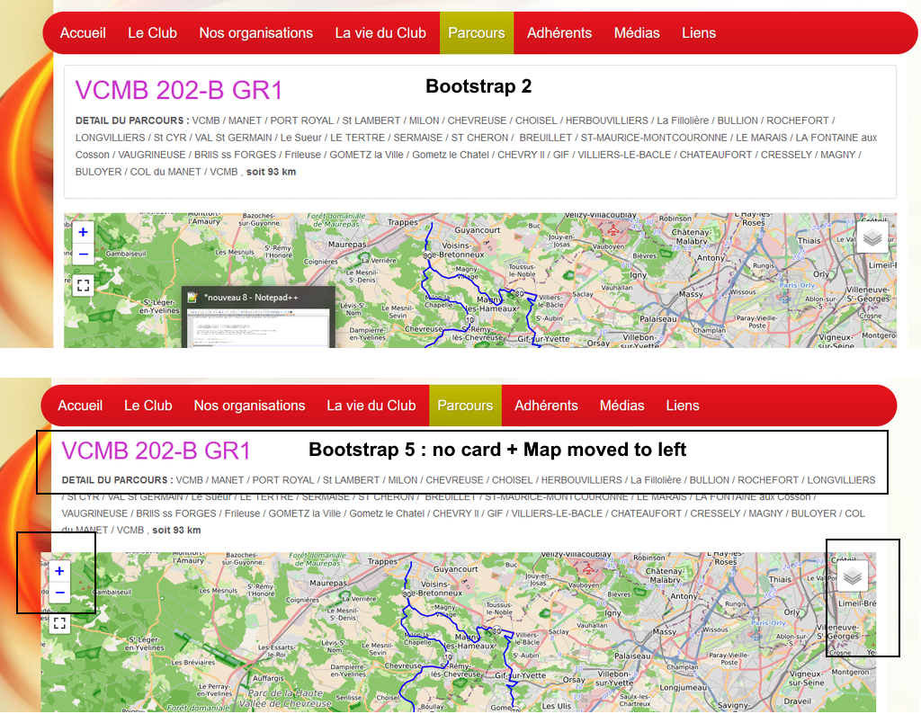 If I change to Bootstrap 3 to 5, my layout changes : map get larger than screen and I'm loosing card effect... I was expecting to have no change but more options after upgrade.