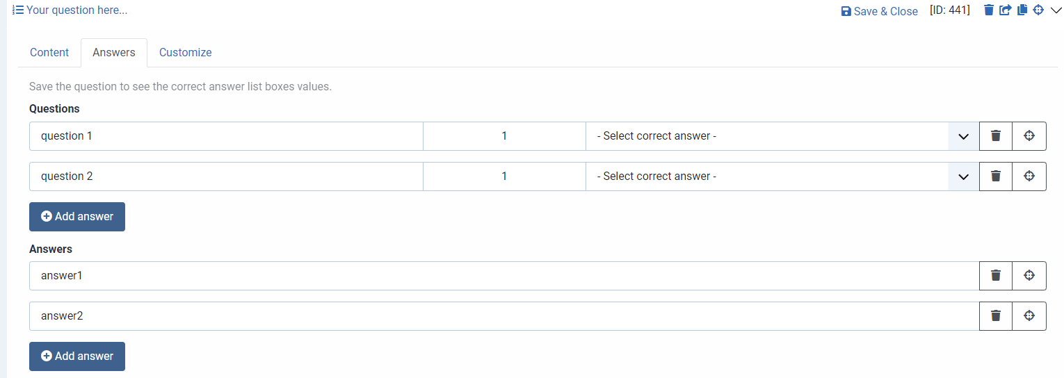I understand, I need to save the question to see the correct answer list boxes values, however when I try to save the question I get an alert which says 'Please select the correct answer(s) in the answers tab.'