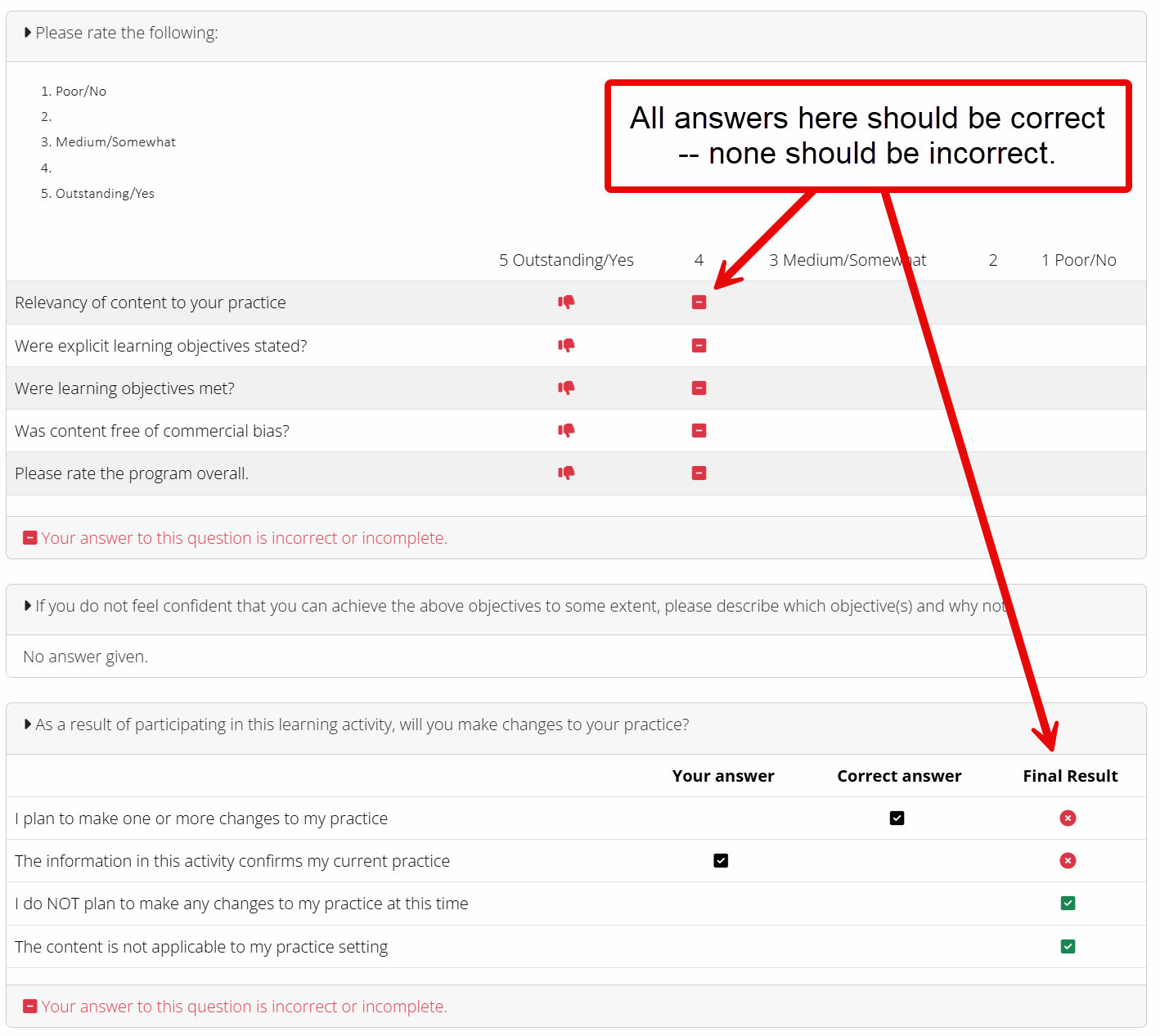 We have a survey at the end of some of our quizzes, and its answers should not be regarded as correct or incorrect. However, I don't see an option to use certain types of questions without setting at least one answer as right or wrong in each question. For example, I show an example of a Single Selection (radio) and the Radio Grid below as they appear in the score report. These may give the users the wrong impression about whether we consider their opinions or feedback correct or incorrect. These particular questions are set to "Exclude from Scoring" and are not Mandatory.
