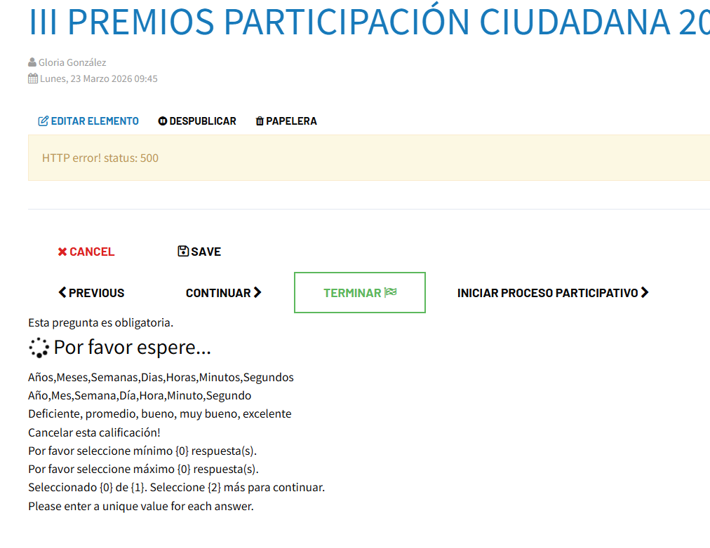 2. The survey view is broken: all language strings are rendered as raw text on the page (e.g. "Años,Meses,Semanas,Dias,Horas,Minutos,Segundos", "Deficiente, promedio, bueno, muy bueno, excelente", "Por favor seleccione mínimo {0} respuesta(s)", etc.) instead of being loaded properly by the component.
