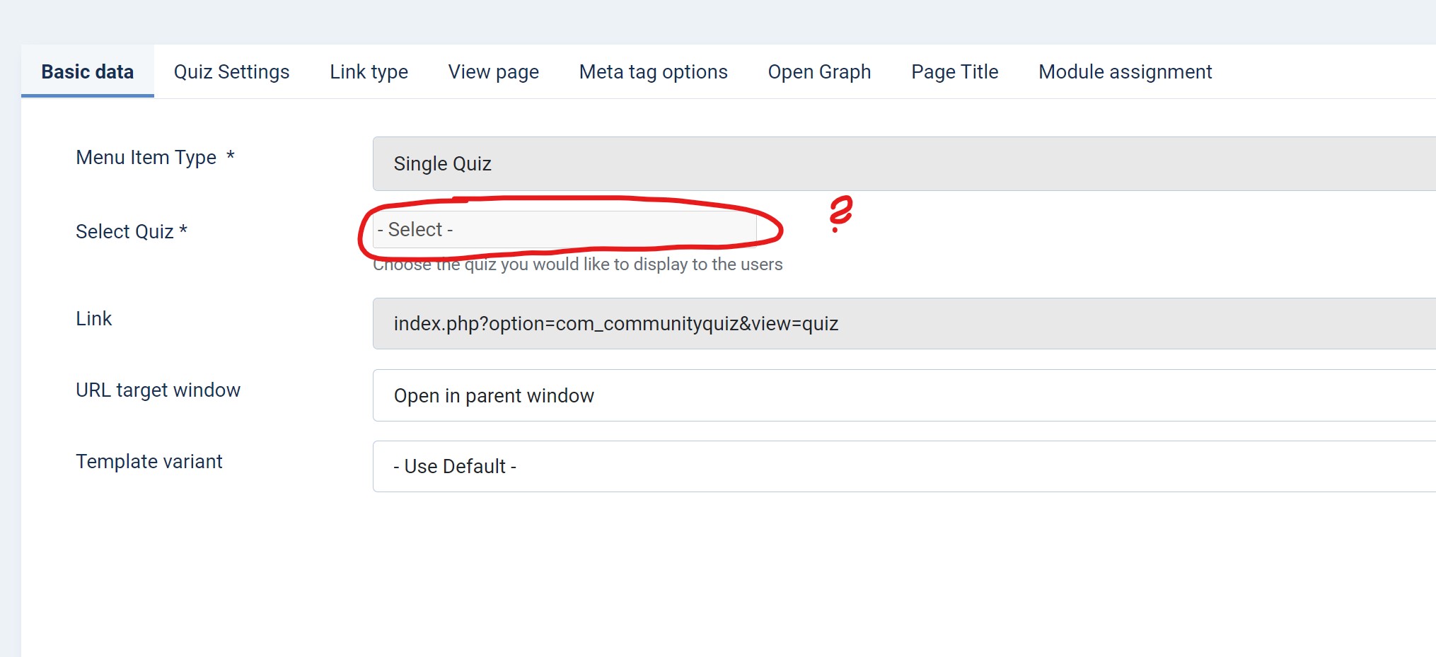 It is not possible to insert only one quiz into the menu, because the option to select a quiz is missing. After clicking in the selection window, nothing is displayed, so there is nothing to choose.