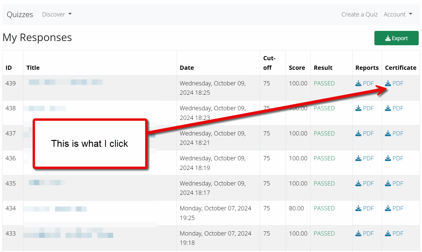 Hi, after I have completed and passed a quiz, and I click on the PDF certificate link listed in the Community Quizzes "My Responses" menu item, I get a "Page not found" error.