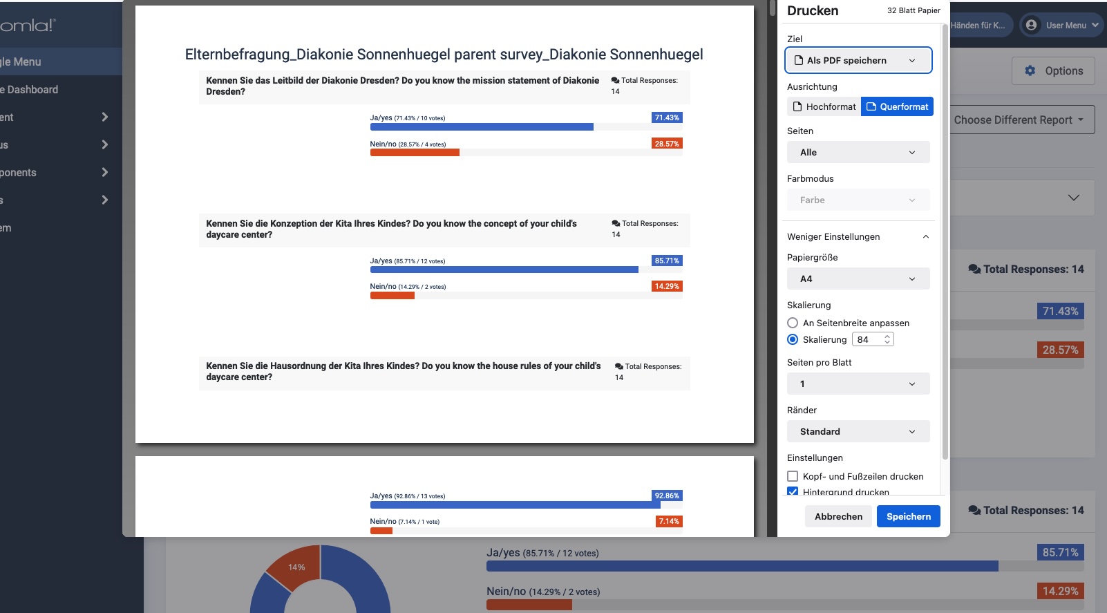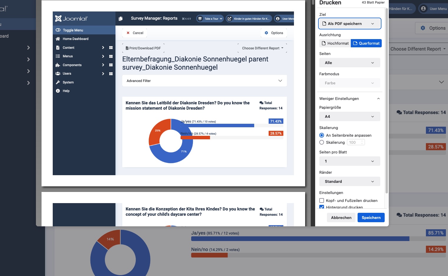 I am using the latest version of Community Survey and Joomla 4.4.9. When I go to 'View consolidated report' and click on 'Print/Download PDF', the pie charts are missing. If I use the browser's print function, the pie charts are there, but so is the Joomla interface, which I do not want in the export.