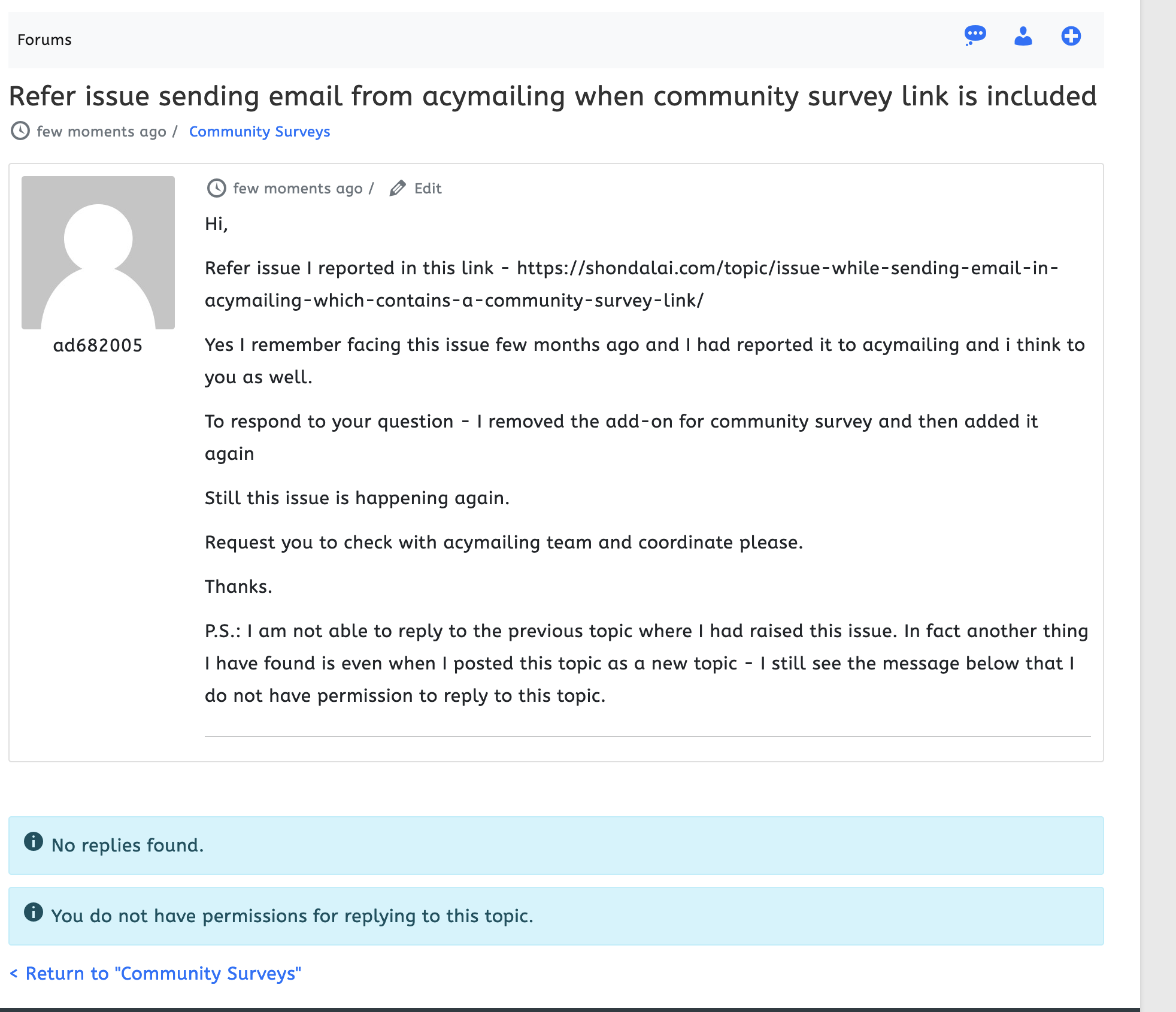 P.S.: I am not able to reply to the previous topic where I had raised this issue. In fact another thing I have found is even when I posted this topic as a new topic - I still see the message below that I do not have permission to reply to this topic.