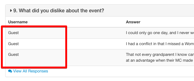 Hi Maverick,When using a multiline question field, in the reports it has the Username column and if my survey doesn't let the user login, it shows Guest. Well, I use the Invite feature and group that I use to send the invite has Names, so is it possible to show the Name of the person who participated instead of Guest? Also, the column name instead of Username maybe it should say Name or Participant. Maverick, also in the new response email, in the template there is a placeholder {AUTHOR_NAME}. When I get the notification, the {AUTHOR_NAME} is blank. Should this also pull from the Invite Lists name column? Technically, the responder is not anonymous at all. Just a side comment, can you use a different placeholder name for this, something like "{RESPONDER_NAME} or {PARTICIPANT_NAME}", the {AUTHOR_NAME} is also used in the new survey template.Thanks!
