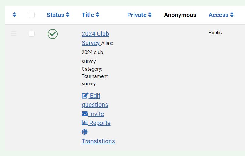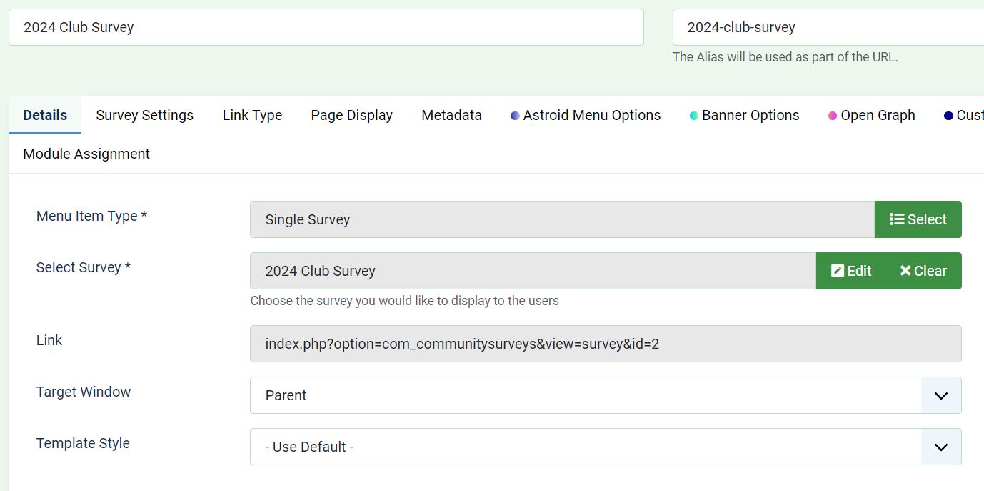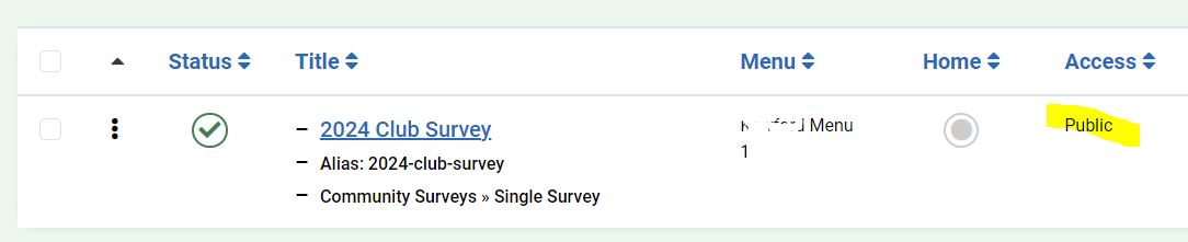 I have set the Joomla menu item up as 'public' and points to 'Single Survey' and '2024 Club Survey'. Access for this menu item is 'Public'.