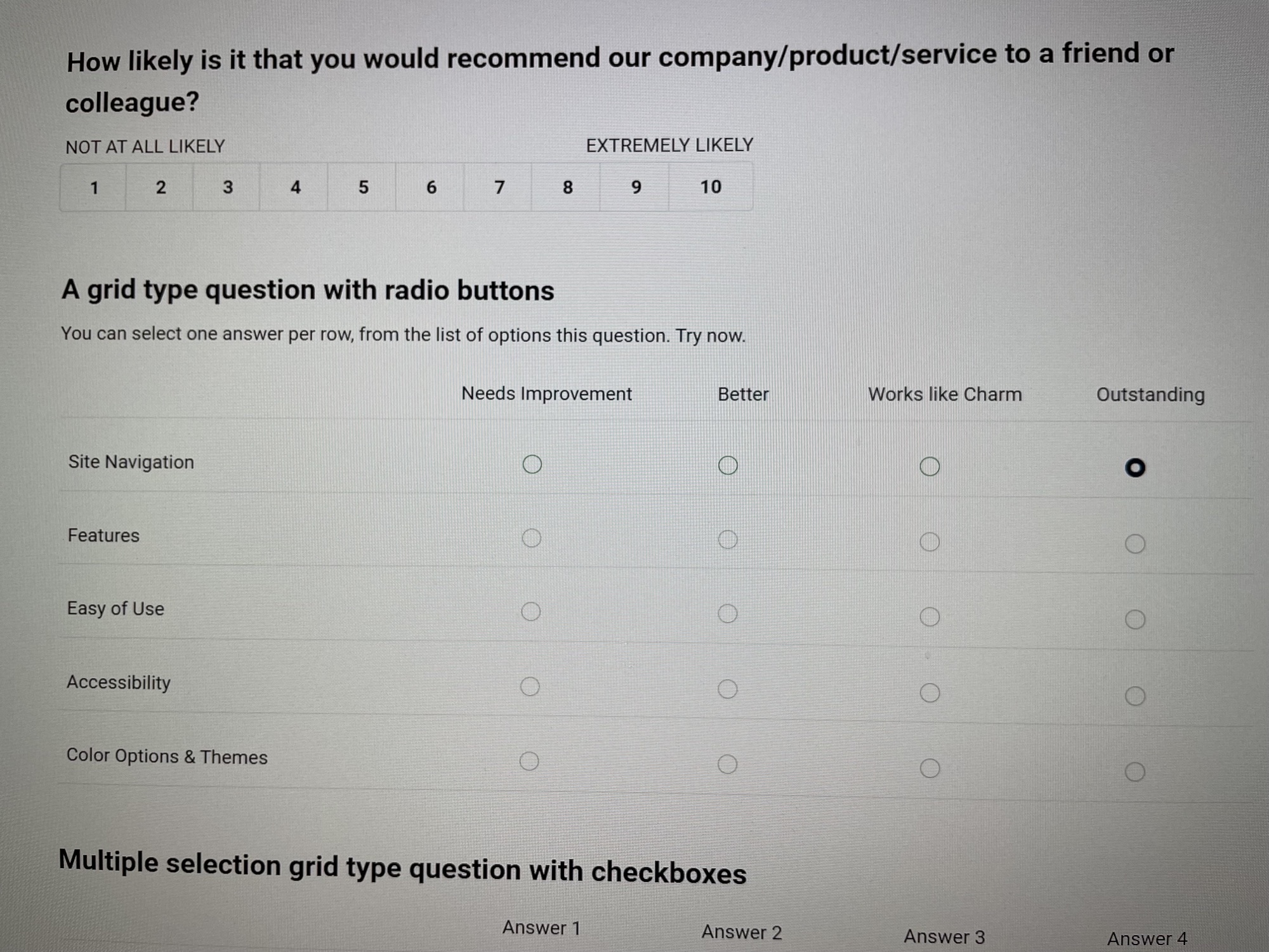 I have upgraded to Joomla 4 including the latest version of Community Surveys. Either with my new template or the default Joomla Cassiopeia the layout looks messed up. It doesn't matter what 'default layout' I choose it looks the same. I haven't made any changes since Joomla 3 but of course, I'm using a different template. Essentially, the four choices for each answer are stacked, rather than tabbed out in a row. Is there a simple way to make my form look like your demo? See images attached.