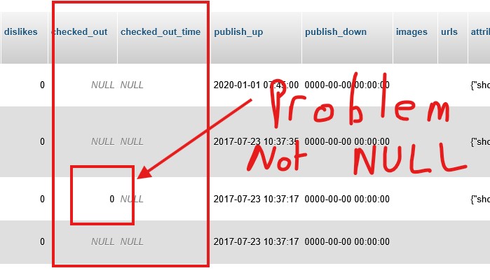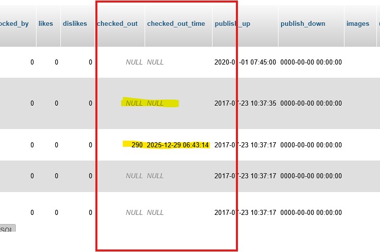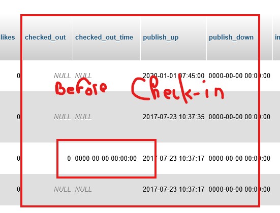 If check_out values are set manually to NULL, Joomla check_in cleeared!